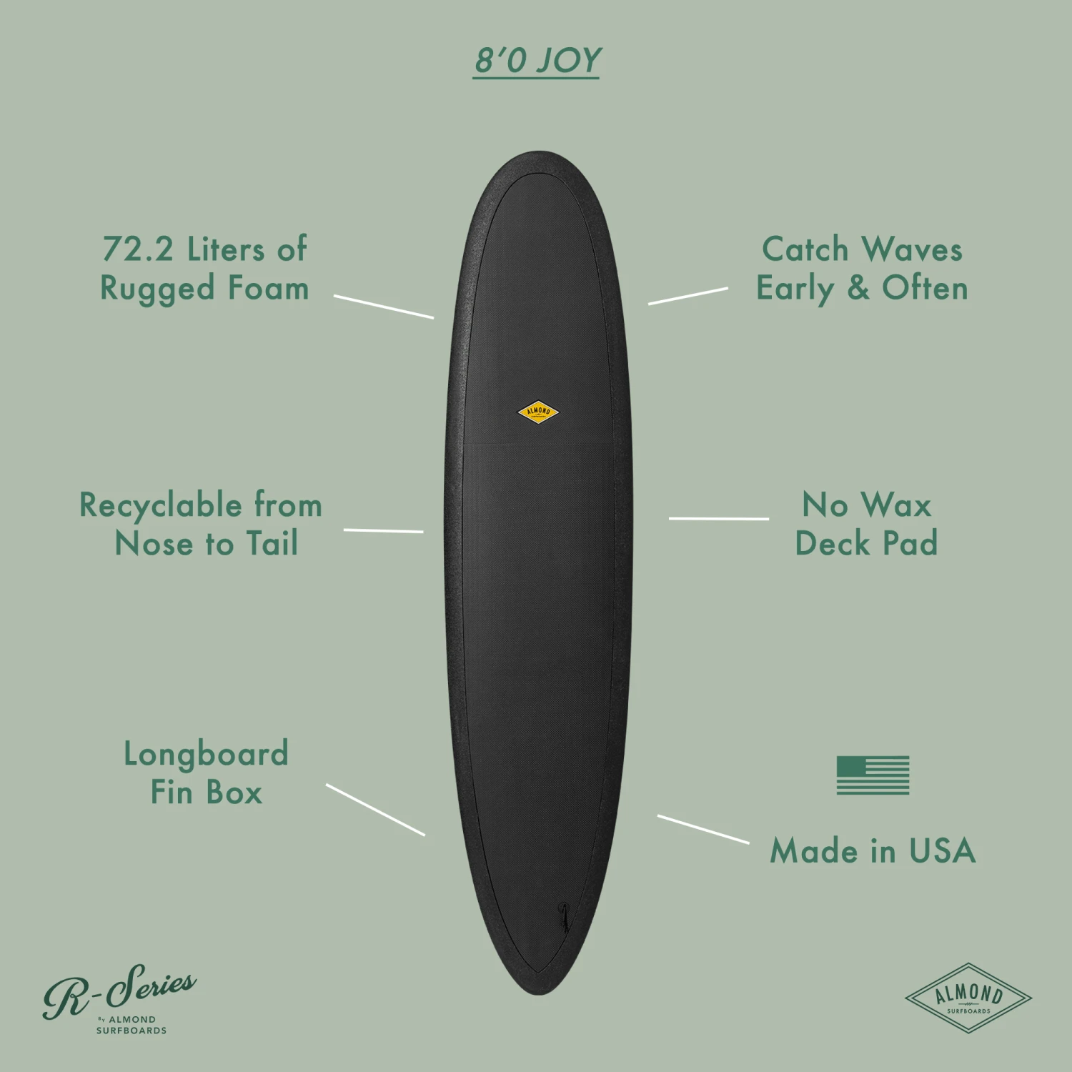 At 8’0 long and 22″ wide, the R-Series Joy is designed to be the go-to surfboard for all ages and stages. (Appropriate for surfers from 65 lbs to 250 lbs)