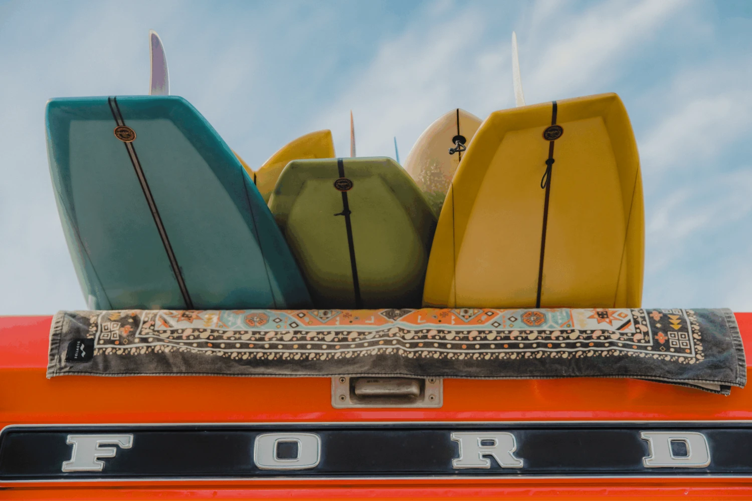 Almond Surfboards Quiver in the back of an old Ford Truck.
