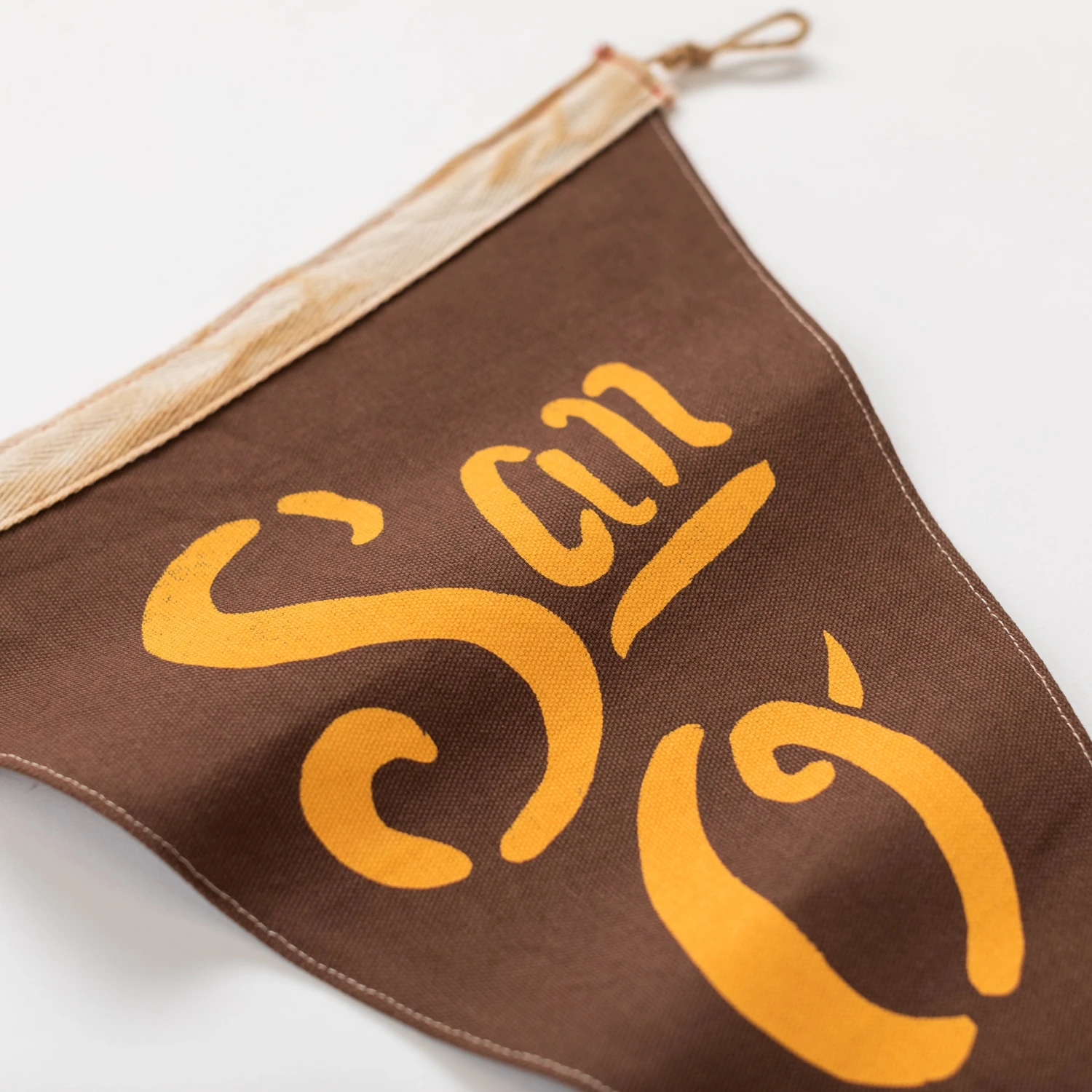 Each flag is hand-painted, stitched and prepared to be hung with photo, art or object collections