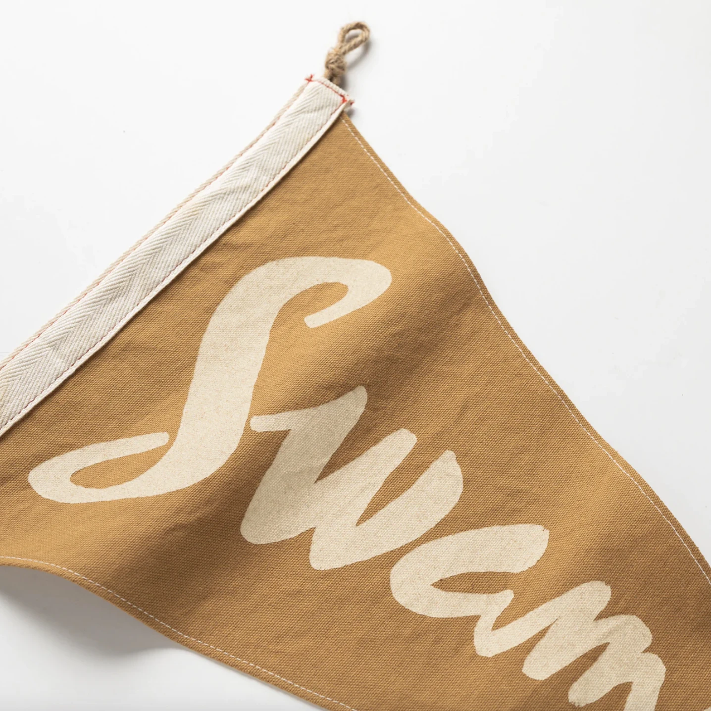 Each flag is hand-painted, stitched and prepared to be hung with photo, art or object collections