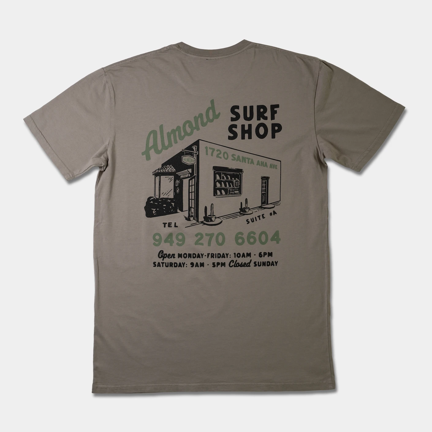 The Service Tee features a lovely illustration of our surf shop by Sam O’Brien of Sample Co.